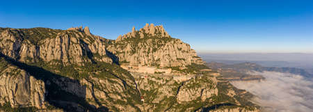 Panoramic aerial drone shot of Montserrat mountain range near Barcelona in winter morning time with fog