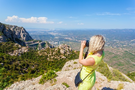 Female traveler enjoying the views from the mountains of Montserrat in Spain and makes a photo