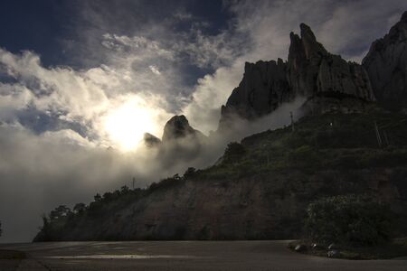 Clouds over Montserrat mountain range near Barcelona, in Catalonia Spain. Rocky landscape. Morning time