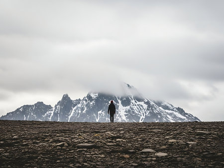 Hiker in the mountains on a cloudy day. Trekking in Iceland