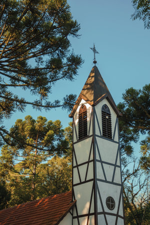 Belfry from church in traditional German-influenced style among several trees at the Immigrant Village Park of Nova Petropolis. A lovely rural town founded by German immigrants in southern Brazil.