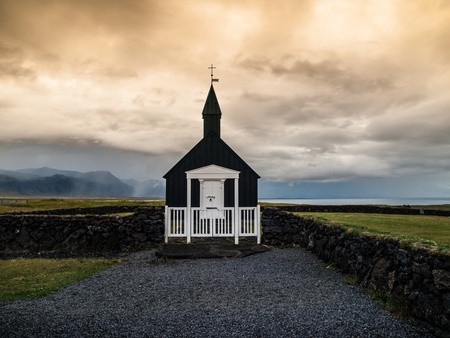 dramatic shot of Budir church on green field at Snaefellsnes, Iceland