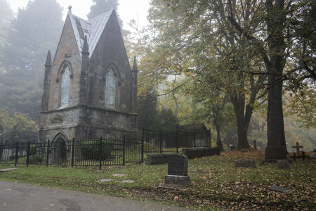 Mausoleum in a foggy old Pioneer Cemetery covered