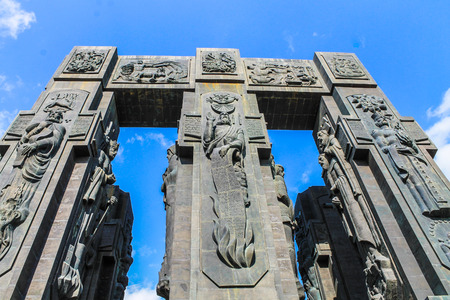 Chronicles of Georgia, monument history, design detail on black sculpture pillars, famous tourist attraction, located on Keeni hill near the Tbilisi sea, Georgia, with white fog sky after rain day.