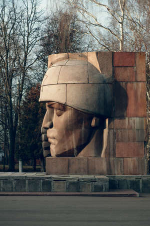 KOLOMNA, RUSSIA - MARCH, 12, 2020: War memorial in memory of the Second World War and the Great Patriotic War of 1941-1945. Sculpture Head of a soldier made of granite stone in profile of Kolomna, Russia