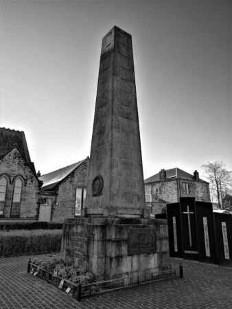A view of a war memorial monumental obelisk in the west Lothian town of Bathgate in Scotland.