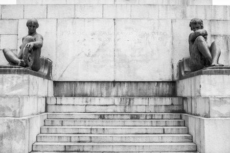 Monochrome image of a pair of sculptures sitting on the stairs