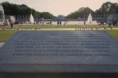 WASHINGTON D.C. - MAY 25 2014: Dedicatory plaque and WWII memorial with Lincoln Memorial in background.