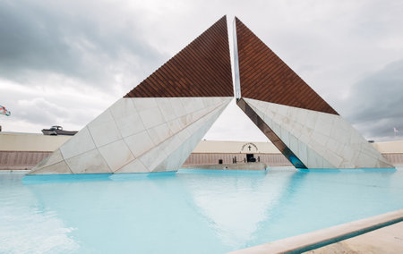 Perfectly symmetrical geometry of the Monument to Overseas Combatants with a little blue water pool in the heart of Lisbon, Portugal.