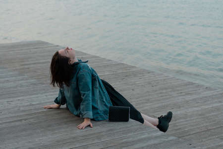 Young woman relaxing on pier. laying on the pier and watching in the sky. listening some music