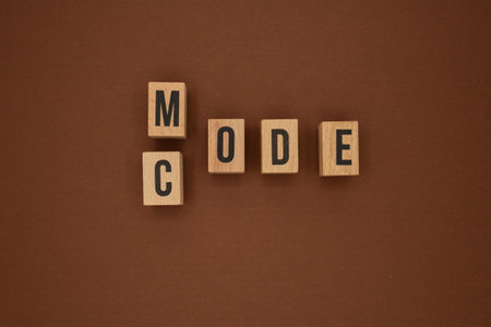 Wooden blocks forming the words CODE and MODE on brown background, concept of programming and style.