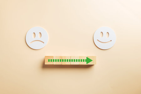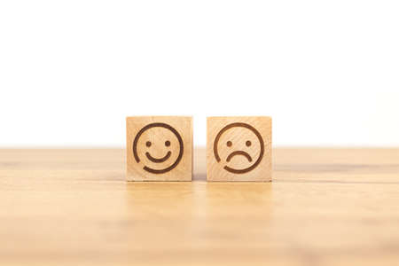 Smiley face and blurred sad face icon on wood cube. Customer service and satisfaction concept