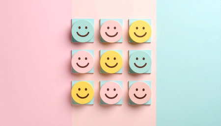 Nine pastel-colored square blocks, each displaying a simple smiling face, arranged in a grid on a pink, peach, and light blue background