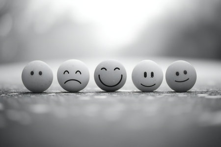 A row of wooden tiles displaying expressive sad face symbols, set against a sleek surface with a blurred background, evoking feelings of melancholy or disappointment