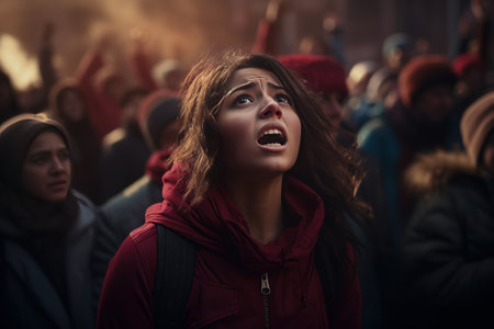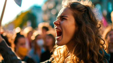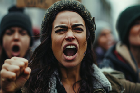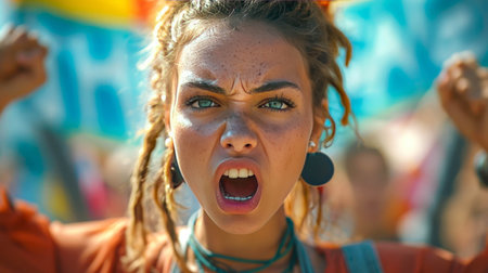Passionate Woman Yelling at Rally Surrounded by Supporters in Urban Setting.