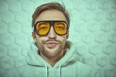 Portrait of a cool young man in white hoody and stylish yellow sunglasses. Youth style, men's fashion.