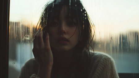 A woman stands by a window, looking out with a distant expression. Soft natural light streams through the window, casting shadows on her face.