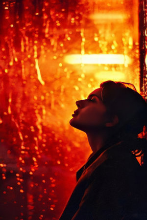 woman in a raincoat with window on the background of night city