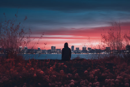 silhouette of a person standing in front of a city at sunset