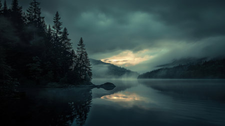 Mountain lake with fog and reflection in the water. Dramatic landscape
