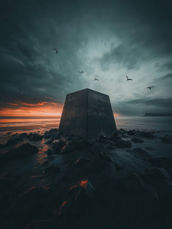 Dramatic Sunset Seascape Dark Stone Structure Birds Flying Coastal Scene sky art view mood calm wild