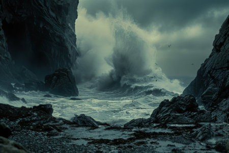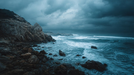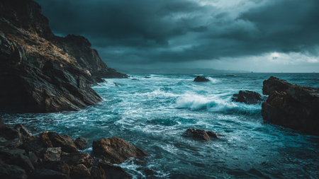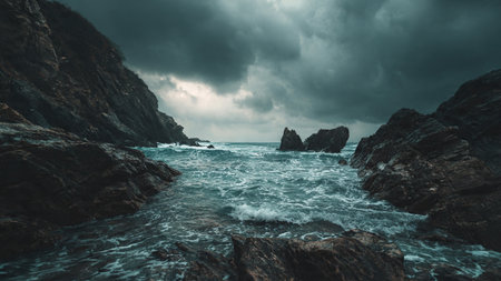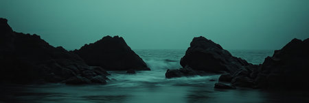 Dark Teal Ocean Rocks Dramatic Coastal Scene Serene Nature Seascape Moody Atmosphere Tranquil Water