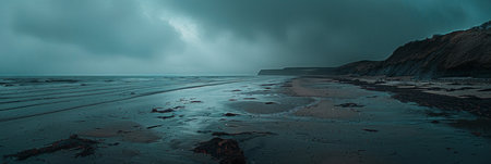 Stormy seascape. Dramatic overcast sky over the rocky sea shore.