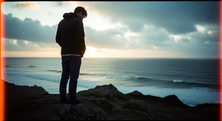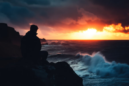 Close-up of a solitary figure standing on a cliff at sunset, gazing at turbulent sea waves under dramatic skies.