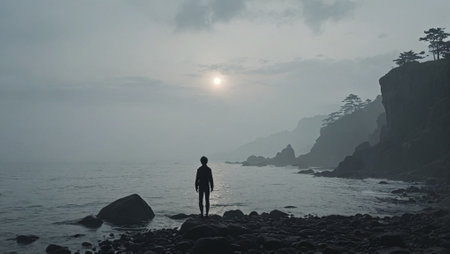 Lone figure on misty cliff at sunrise with ocean view