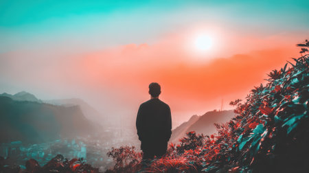 A solitary figure stands silhouetted against a colorful sky, gazing at the sun setting over a misty mountain landscape. A moment of peace and contemplation in nature.