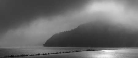 Korea Cheongju City Daecheong Lake Morning, Water fog scenery, monochrome photography