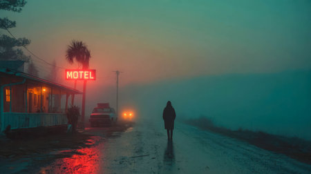 Lone man walking towards a neon-lit motel through a foggy, deserted road at dusk with eerie atmosphere.