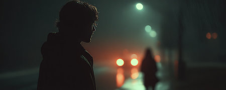 Artwork decoration. A man walking on road at night. The silhouette of a man standing in the middle of the road on a misty night. The glare of the street light against the fog sets a creepy mood.