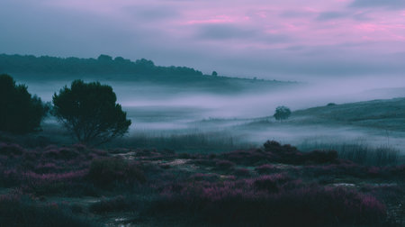 A tranquil landscape featuring mist and fog at dawn, with soft pastel colors and serene scenery, creating a peaceful atmosphere for nature lovers.