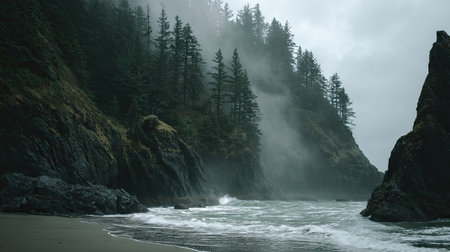 Experience the serene beauty of a misty mountain landscape featuring lush forests and rocky slopes, enveloped in a soft fog, perfect for nature enthusiasts.