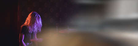 Spots of light with copy space against female drummer playing drums. music festival and concert concept