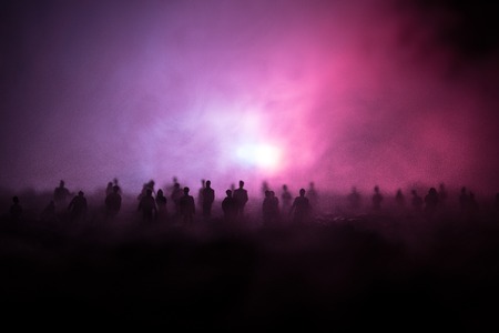 Silhouettes of a crowd standing at field behind the blurred foggy background. Selective focus. Revolution, people protest against government, man fighting for rights