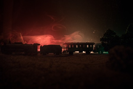 Train moving in fog. Ancient steam locomotive in night. Night train moving on railroad. toned foggy fire background. Horror mystical scene. Selective focus