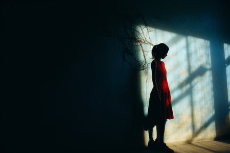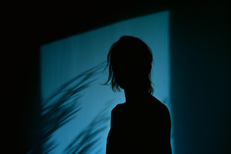 Silhouette of an anonymous woman partially hiding her face in deep shadows, creating a mysterious and secretive atmosphere