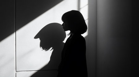 A woman stands in profile, her silhouette sharply defined against a wall illuminated by strong light, creating a dramatic shadow. The black and white tones enhance the mood.