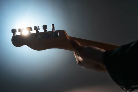 Guitar neck. Close-up view of rock musician man playing electric guitar. Smoky spotlight during concert on stage.