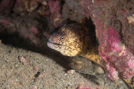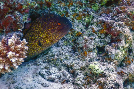 Goldentail Moray eel waiting for prey (Gymnothorax miliaris) Tropical waters, Marine life