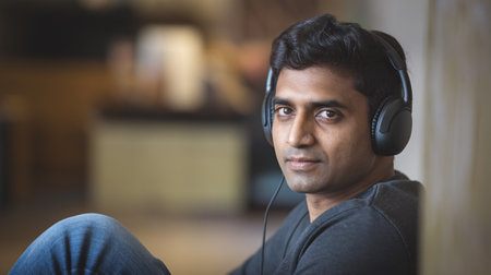 Young South Asian man with headphones relaxing indoors, deep in thought, enjoying music or audio.