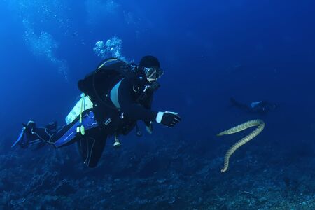 diver with sea snake nderwater diving picture ocean