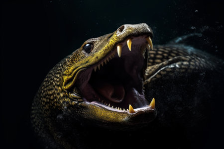 Close-up portrait of a snake with open mouth on black background