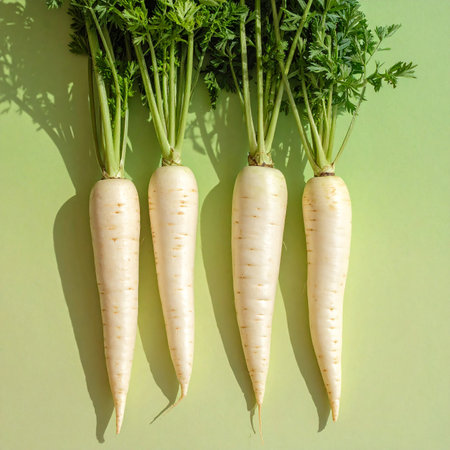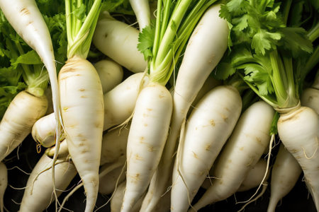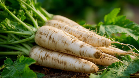 Discover the beauty of a fresh white radish with vibrant green leaves, perfect for enhancing culinary dishes and healthy diets.