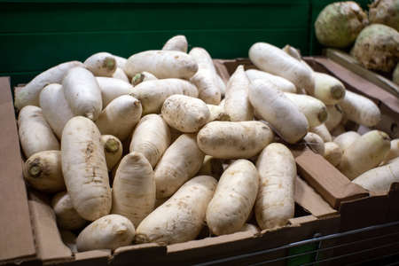 fresh white radish at vegetable store for sale at evening
