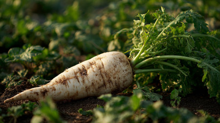 Fresh Daikon Radishes Growing in Rich Soil, a Bountiful Harvest