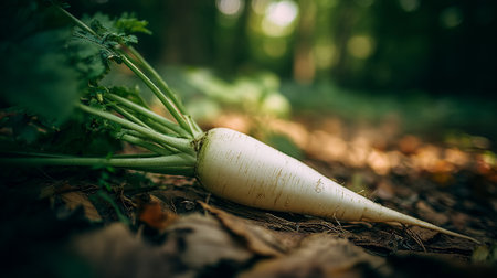 Freshly Harvested Daikon Radish Resting on Forest Floor After Pulling
