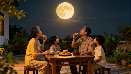 Happy asian family having breakfast in front of the full moon.